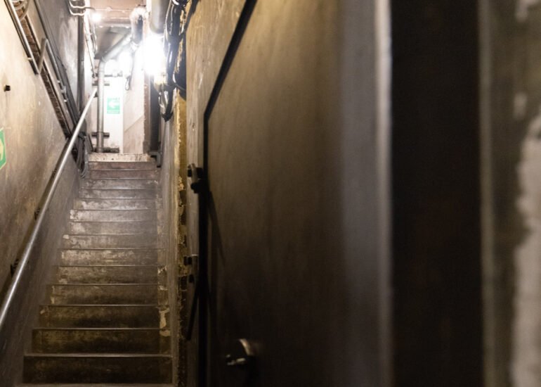 At the bottom of the stairs is a space that was re-purposed as a typing pool, with a small access passage to one side – wide enough to fit a tea trolly through we were told.