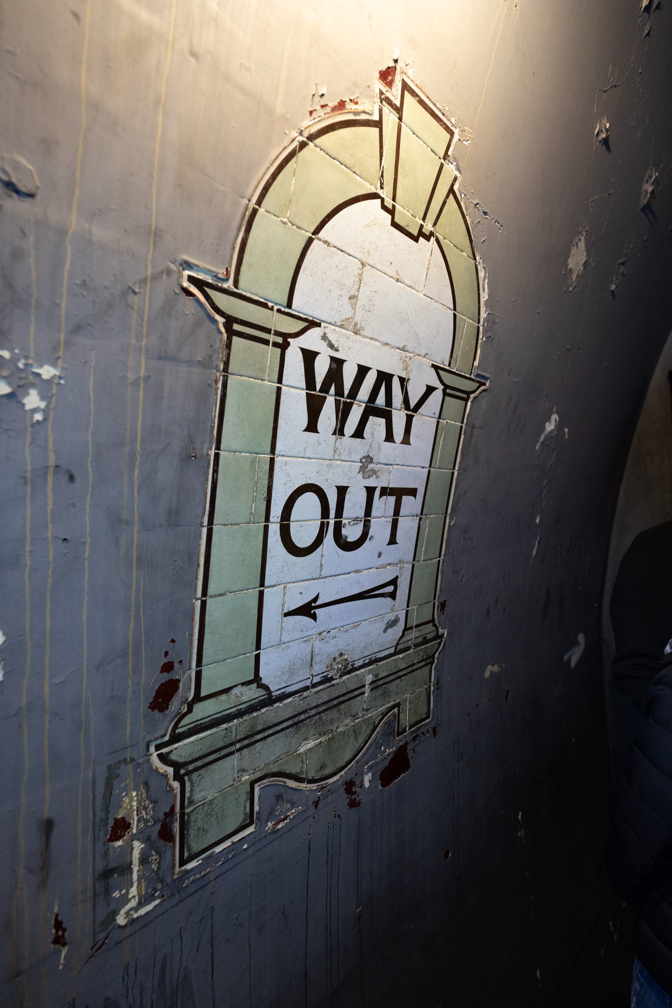 At the bottom of the first flight of steps is a blast-proof door, and there are remains of some signage that looks to have been hand painted at the top of the spiral staircase.