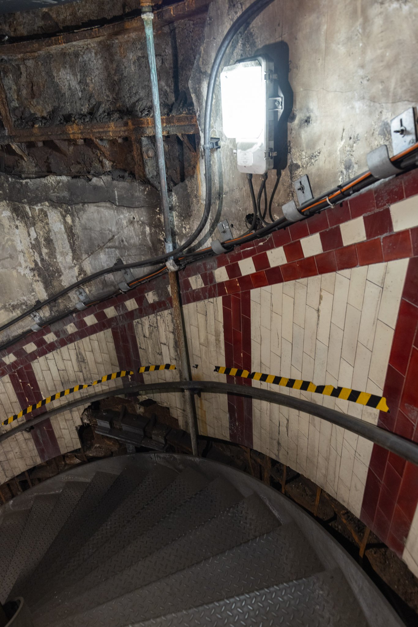 The façade of the station building still remains on Down Street with the Oxblood red tiles but the ticket hall has long since been replaced by a convenience store. Access to the station is now only accessible through a metal door at the side of the shop which leads directly down a flight of stairs to the top of the spiral staircase which leads down to the tunnels.